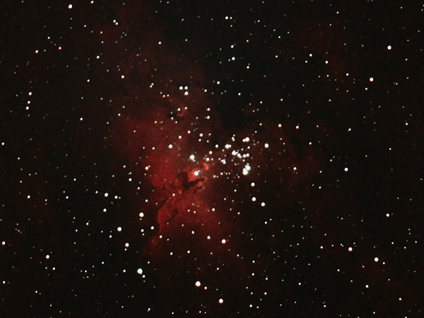 taky jsem si cvaknul Orli mlhovinu. Podminky nebyly nejlepsi, objekt byl cca 5 stupnu nad protejsim panelakem a jeste ke vsemu jsem vybral pointacni hvezdu dost daleko a je to znat. I pres to jsem neveril, ze bych z toho dostal toto :]
