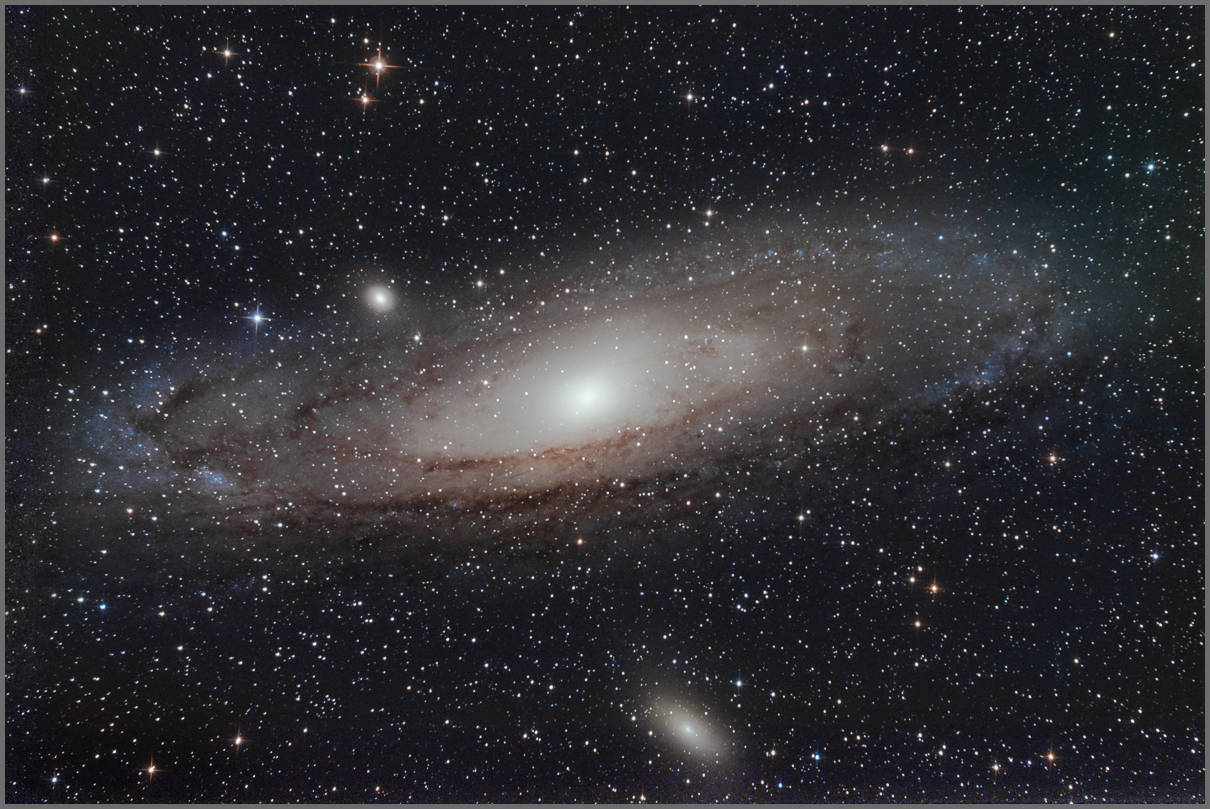 ta data nejsou špatná, jen dost barevně ujetá (asi chyba v kalibraci), a škoda těch ostrých pruhů vlevo a dole od nesedící kompozice jednotlivých snímků. To by se ale dalo "odmalovat" v PS, při troše snahy. Jinak bez jakýchkoli malovacích úprav, zpracováno v PixInsight, vypadne toto (a nechá se to i pěkně saturovat, když se člověk zbaví těch barevných gradientů):