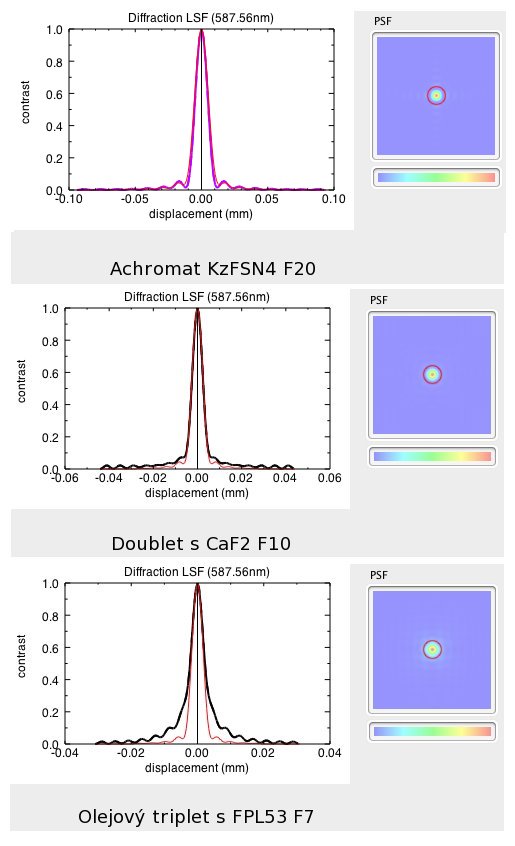 V LensForge jsem dělal porovnání 150 mm Achromátu, super APO v doubletu a olejového tripletu a vyšlo to celkem zajímavě. Červeně je v obrazu hvězdy zobrazen Airyho disk.