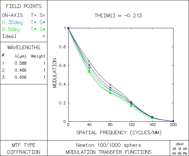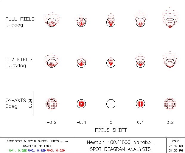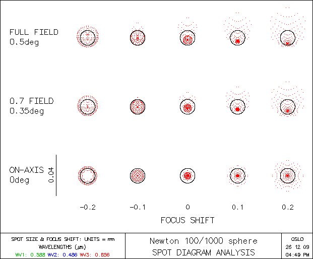 Ještě mě napadlo takové malé porovnání mého dalekohledu Astro 100 (Newton 100/1000 se sférickým zrcadlem) a Newton 100/1000 s parabolickým zrcadlem. Docela znatelný rozdíl je ve spot diagramu, MTF je prakticky totožné.