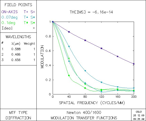 Pro zajímavost dávám MTF Newtonu 400/1600. Tady je vidět, že pokles kontrastu je již prakticky kousek od osy velmi výrazný a proto je celé zorné pole nastaveno na 0,2 stupně (tedy 10x menší než u předchozích grafů). Zde je naprosto jasně vidět, že bez Paracorru či podobného korektoru je skoro nesmysl takovým dalekohledem pozorovat planety - v tom má Milan pravdu.