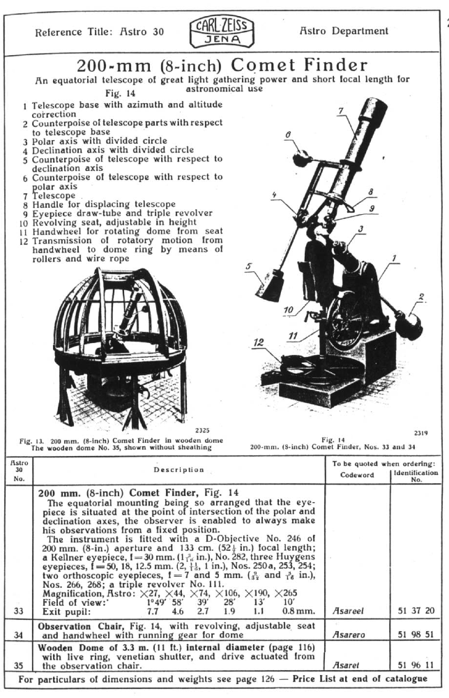 Mám tři pdfka. Dva německé katalogy údajně z let 1916 a 1920. Tyto letopočty ale nejsou součástí textu. Potom ještě mám francouzské vydání, kde je i ceník k 1.7.1920. Ohledně hledače komet (Chercheur de cometes parallactique de 200 mm, Kometensucher 200 mm parallaktischer) se všechna vydání shodují jak v celkovém snímku dalekohledu včetně pro něj speciální montáže tak i ve výše uvedeném popisu objektivu typu D.