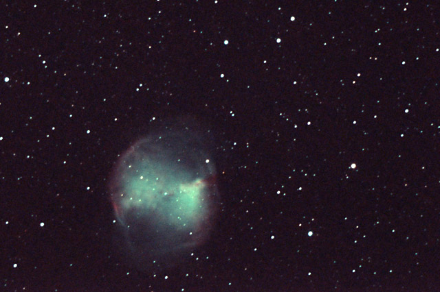 Pokus o M27 ze 10.7.10 - pocatek 21:00 UTC, Canon 40Da, NTW200/1000, ISO 800, 9x8 min, pointace QHY5, komakorektor neni, zpracovano v SUBRAW, registar a PS3.