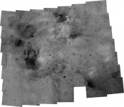 Pri negatívnom zobrazení a zvýšenom kontraste je vidieť rozsiahle hmloviny v oblasti.
