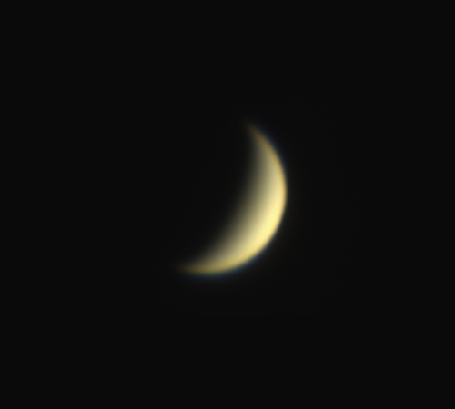 Dnes ráno jsem si také přivstal. Chtěl jsem otestovat Baader UV-Venus filter. Bohužel jsem při snímání narazil na problém s "duchem" který se zobrazuje ve spodní části snímku planety. Otočení kamery nebo filtru nemá pozici "ducha" žádný vliv. Ani při změně vzdálenosti filtru od čipu nedojde k žádné změně. Pokud snímám bez filtru nebo s UV/IR filtrem tak se tam podobná chyba nevyskytuje. Napadá mě, že by se mohlo jednat o odraz planety od filtru v sekundáru a možná i rozkolimovaný dalekohled. Uvítám každou Vaší radu. nepoužil jsem barlow ani hranol.