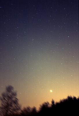 Tak jsem ho vcera vecer konecne videl! A byla to fakt bomba, kolem 20. hodiny kuzel sahal dobrych 40 stupnu; nad zapadni obzor, skoro az k Plejadam. Netusil jsem, ze je to tak vyrazny jev, bylo patrne na prvni pohled a primo bilo do oci. Nejspis za to muzu podekovat vybornym podminkam na novem stanovisti, kde jsem vcera pozoroval, zvecera byla obloha na urovni Bortle 3/4, jak ale zacala padat namraza, trochu se to zhorsilo (mozna proto jsem nevidel protisvit).