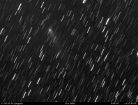 Včera večer som sa dostal k ďalekohľadu, tak som si ju chcel vyfotiť. Na pohľad pekná kometa, primeraná svojej jasnosti. Myslím vizuálne. A rýchla. Expozícia 240 sekúnd bolo priveľa pre ohnisko 1200 mm. No neľutujem. Na spracovanom snímku sa objavil chvost cez pol snímku. Teda viac ako 20 oblúkových minút. Hviezdne pole rušilo, tak som ho potlačil spracovaním. Toto spracovanie nemám rád, no chvostu to prospelo. Myslím, že svojim chvostom a vývojom stojí za chvíle za okulárom, a oddychom pod hviezdnou oblohou.