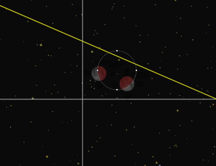 Jenže ten výsledek má stále stejnou chybu. Pokud si nakreslím tečnu obou těch Měsíců, dostává se ta přímka přes střed stínu. Zatím co ve skutečnosti se Měsíc nedostal ke středu snímku, ale procházel od něho jižněji . Takže evidentně je jeden z těch Měsíců špatně na té montáži umístěn .A tak je to od začátku, bez ohledu na polohu pozorovatele nebo použití obzorníkových souřadnic