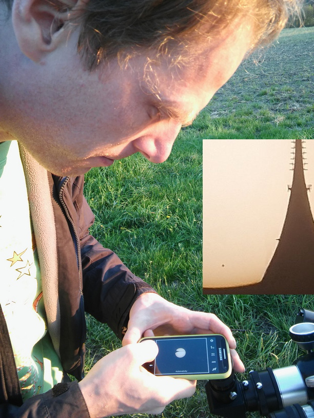 Když už jsi zvolil pevnou polohu skvrn = pevnou pozici Slunce, neměl by se Merkur pohybovat potom po přímce ? Takhle je Slunce jakoby snímané na paralaktice , byť nějak natočené, ale jako statické, kdežtoe Merkur po něm putuje jako v obzorníkovém pohledu.