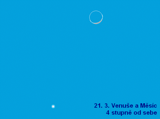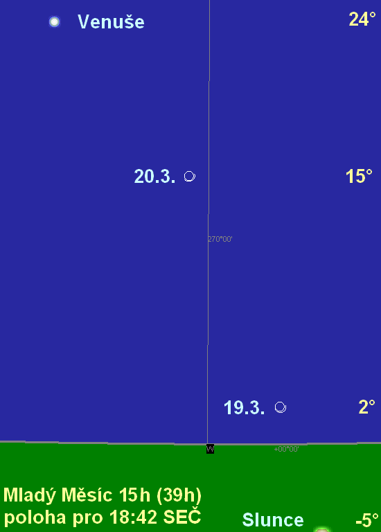 MaG napsal: Opravdu extrémní situace je nachytána na 19. březen, proto jej předesílám už nyní. Měsíc pouze 13 hodin po novu se bude nacházet poměrně výhodně v pozici nad Sluncem. Z toho vyplývá jednak možnost útoku na rekordy v případě excelentních podmínek a jednak na hezké fotografie popelavého svitu v dnech následujících, kdy Měsíc bude vysoko nad obzorem i přes velmi malou fázi.