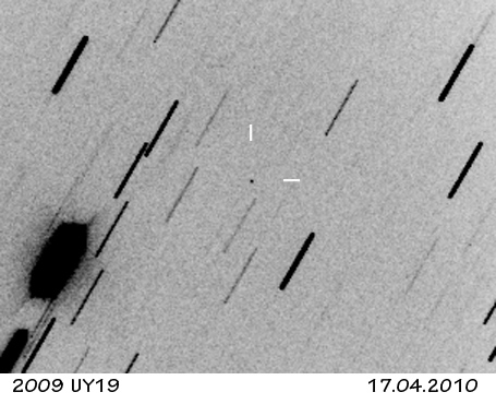Podíval jsem se na efemeridu - dráha je ze 186 pozorování za období necelých 3 měsíců (2012 Feb. 23-May 12) a v době přiblížení je 3-sigma chyba efemeridové polohy skoro 9 stupňů. Momentálně je hluboko na jižní obloze s jasností kolem 25mag, takže nové polohy a zlepšení efemeridy se hned tak nedá očekávat. Až tak 2 týdny před přiblížením se trochu zjasní a čekal bych teprve v té době nějaká upřesnění efemeridy.