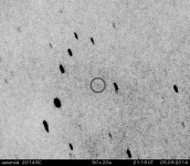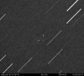 Už tu dlouho nebyl malý šutr, tak dávám fotku blízkozemáku 2014 EP12. Průměr nějakých 35m, jasnost 16,4 mag a hlavně pohyb 1°/hod. Takže foceno pointovaně na hvězdy expozicí 3s ( pohyb o 3"/3s se v seeingu a obraze při skládání "schová") . Na monitoru samozřejmě nebylo vidět nic. Pro zajímavost uvádím, že při vedením za asteroidem pomocí ASCOMu bylo potřeba exponovat 30s, aby na monitoru byl po většinu snímků asteroid vidět. Při vedení za asteroidem sice nevadí jeho rychlost, zato vadí PE montáže .