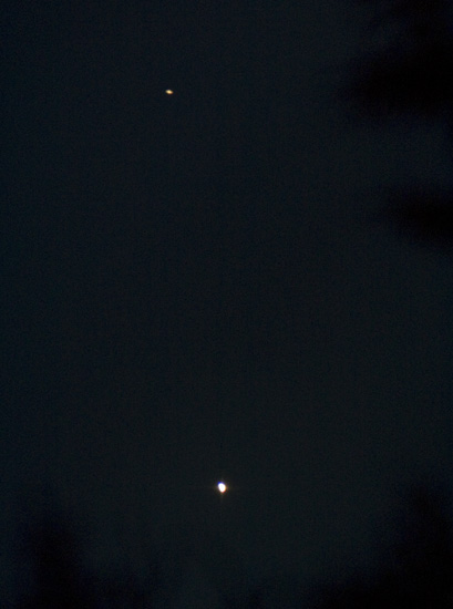 Včera som spravil obrázok pri tesnejšom zoskupení. Výslednú superpozíciu dvoch obrázkov teda pripájam pre predstavu ako sa obe planéty pohli za 24h. Fotené v rovnakom čase, z,registrované na hviezdy a sčítané snímky.