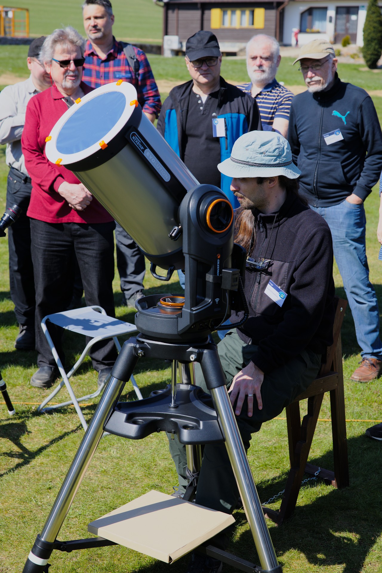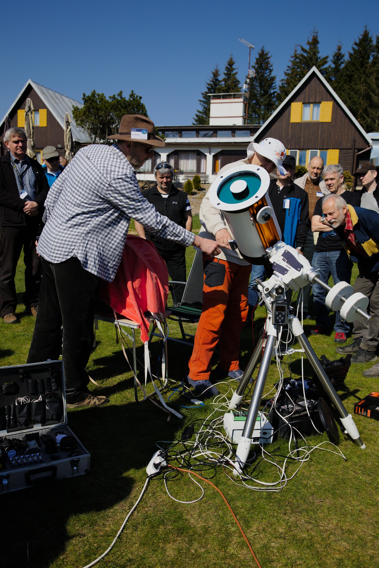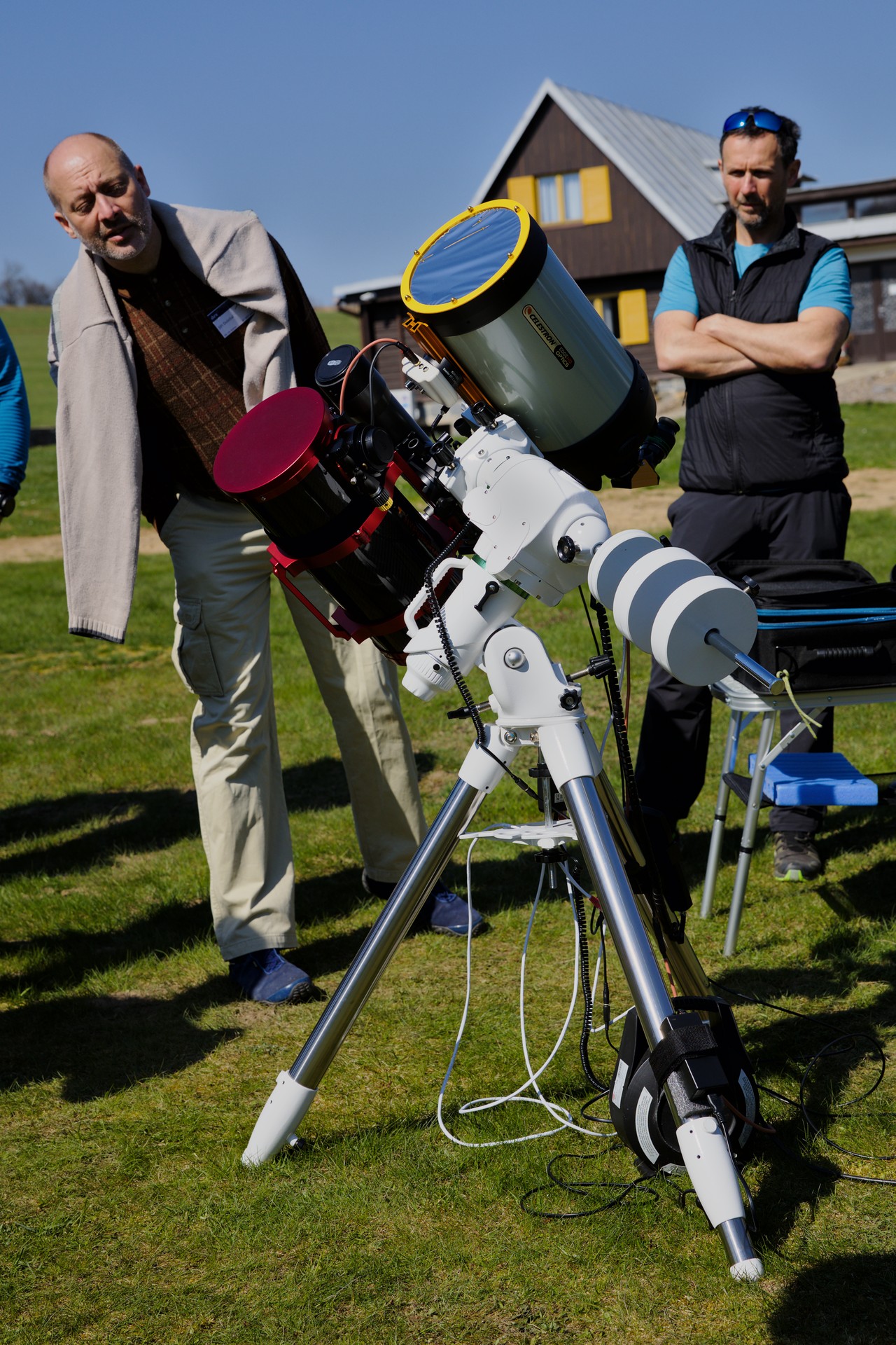 První část prohlídky dalekohledů. Prvních pár fotek je už z pátku, ale přiřadil jsem je k prohlídce, protože tam tematicky patří. Počasí bylo skvělé na pozorování Slunce, s focením techniky už to bylo horší...