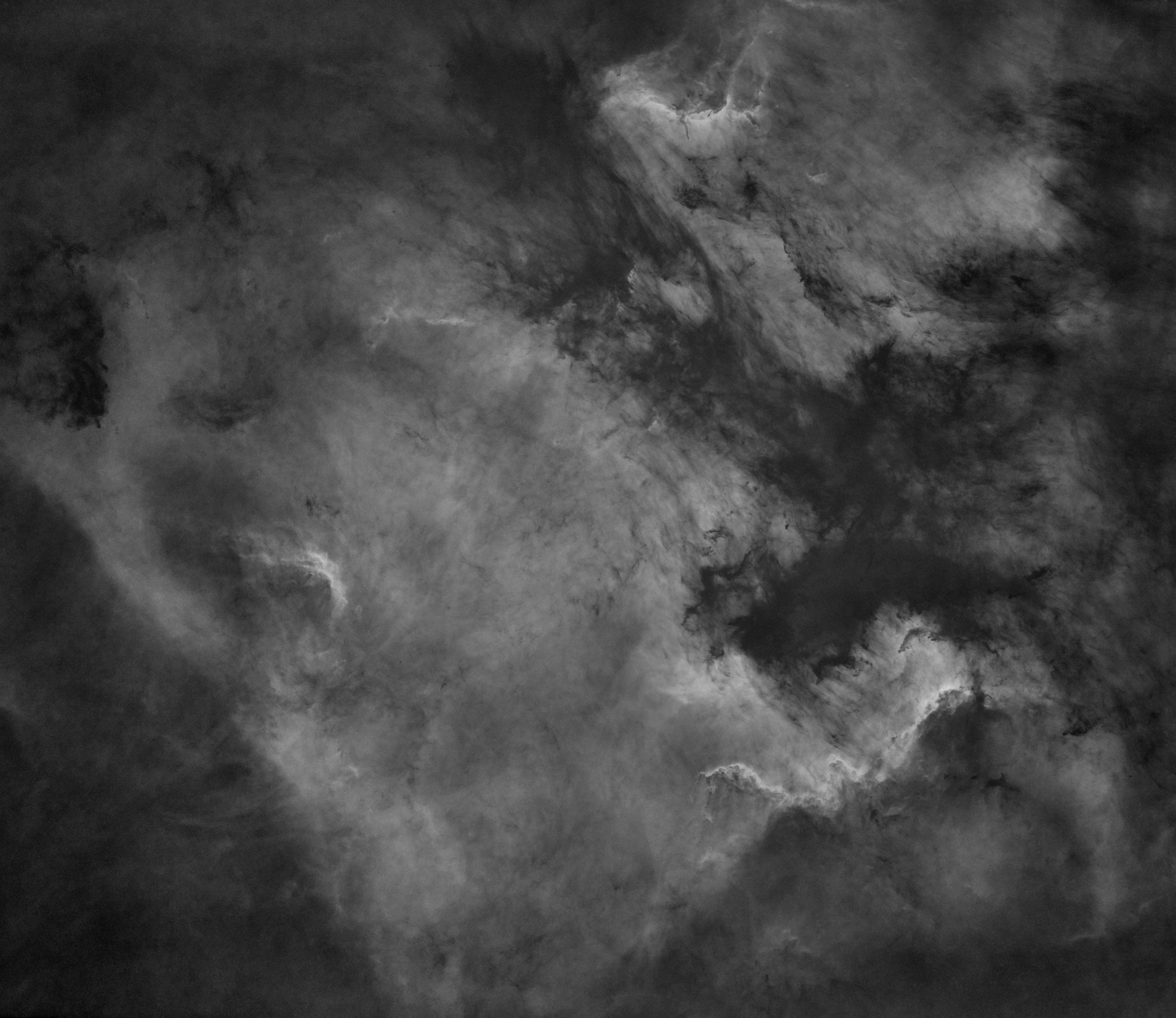 Pokud člověk odstraní hvězdy, tak vyniknou jemné struktury, kterých jsem si ani nevšiml, třeba proudy plynu vytékající z Ameriky vpravo dole. Z mono kamery to jde udělat celkem pěkně.