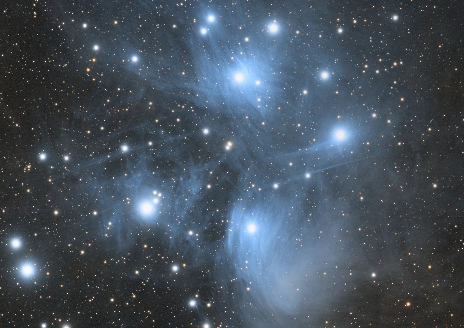 Taky jsem je před pár dny v rámci testu vyfotil..110min Lka + 60min RGB (60s expozice ), foceno Newtonem 200/800, kamera ASI2600mm + Astronomik filtry. Plejády s Newtonem jsou vždycky masakr takže je to samý kříž , ale jako test to posloužilo dobře