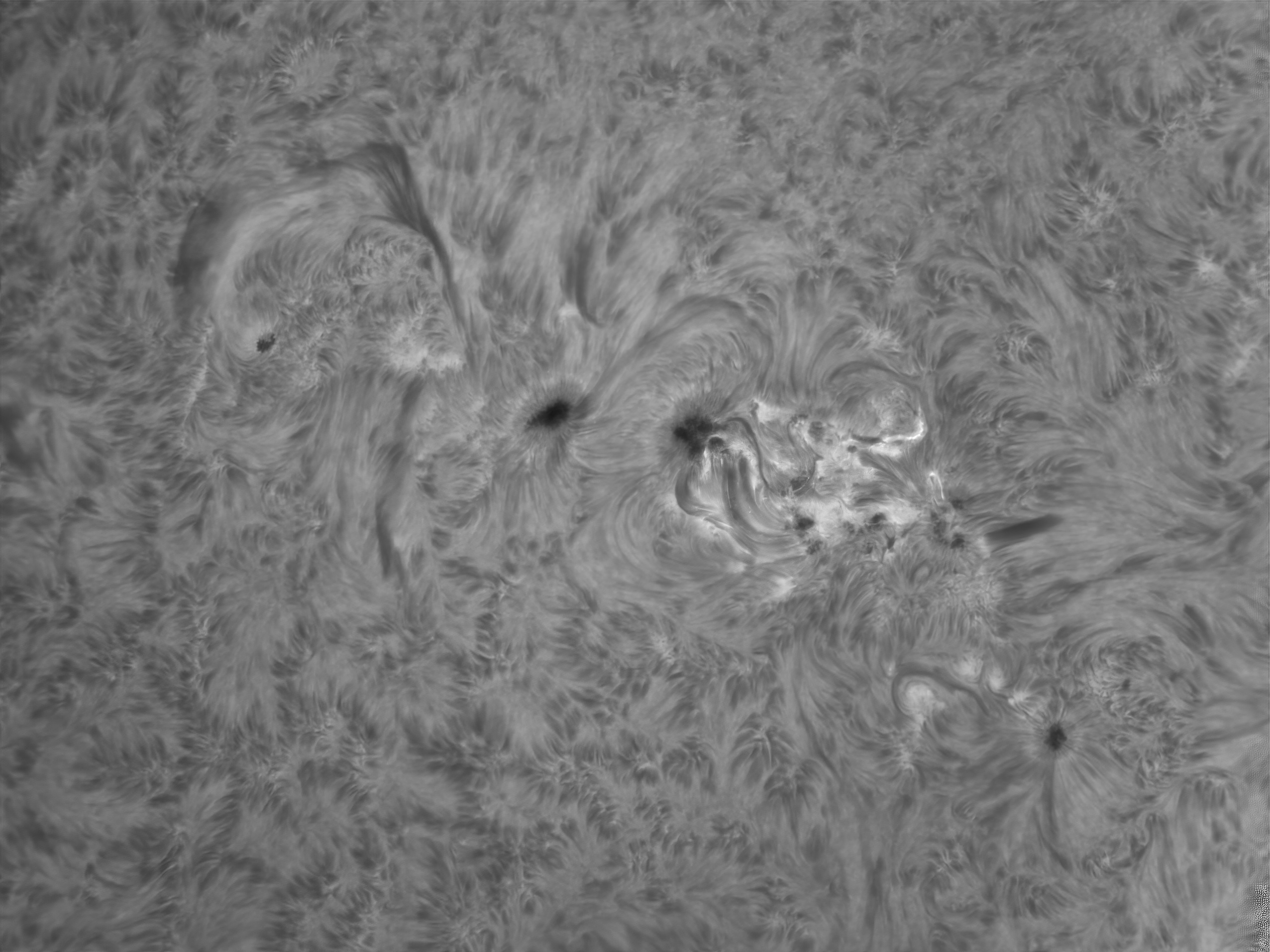 Včerejší předbouřkové Slunce - skupiny skvrn ze Sítin malým APO refrákem 95/585mm přes Herschela a filtr Baader C2 Swan. Seeing byl hodně dobrý.