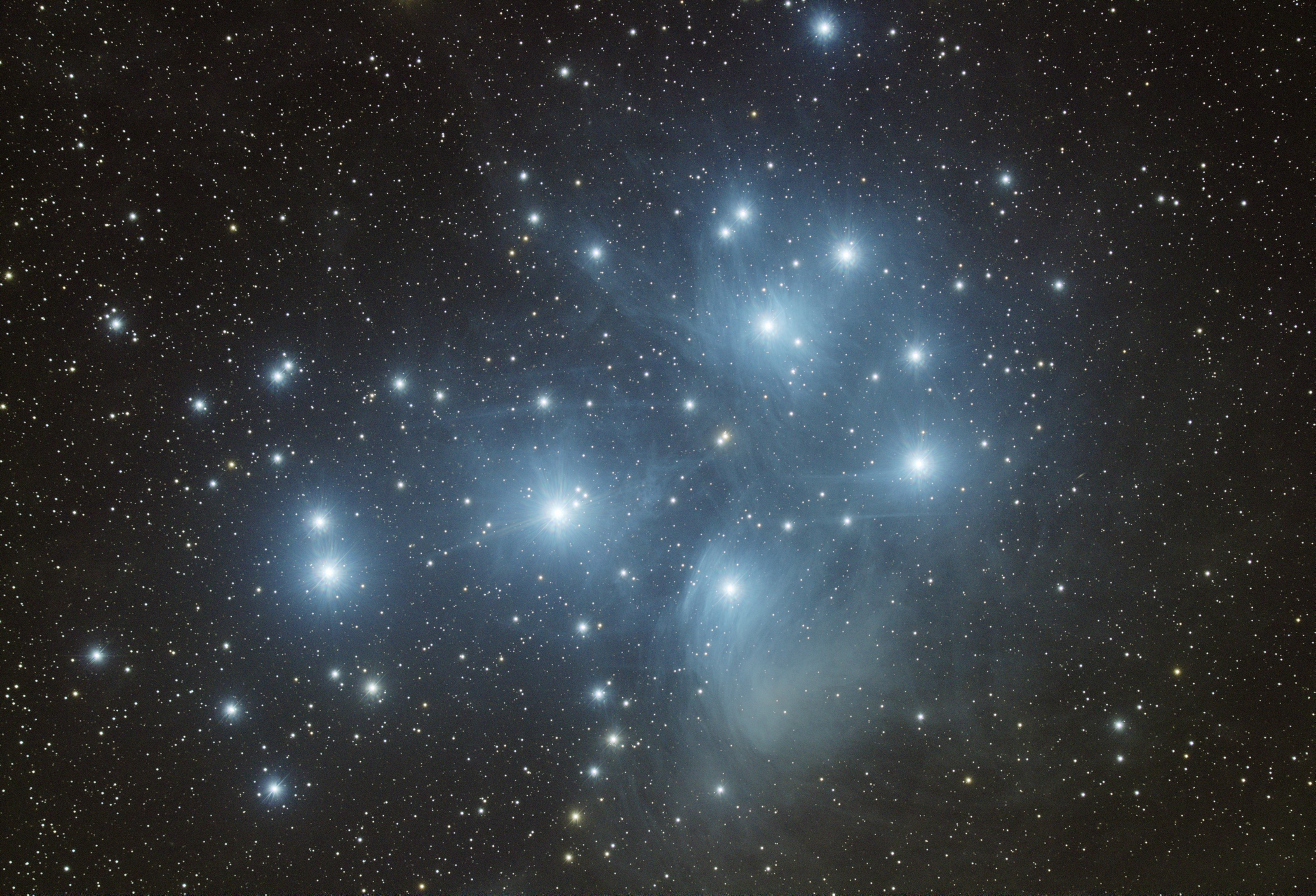 Všimněte si mlhoviny IC 349 (Barnard's Merope Nebula) pod hvězdou Merope, zobrazené jako bílý přeexponovaný výtrysk pod hvězdou. Proto jsem děla pouze 5min expozice na nejnižší zisk, aby mlhovina neskončila v přepáleném obrazu hvězdy Merope.