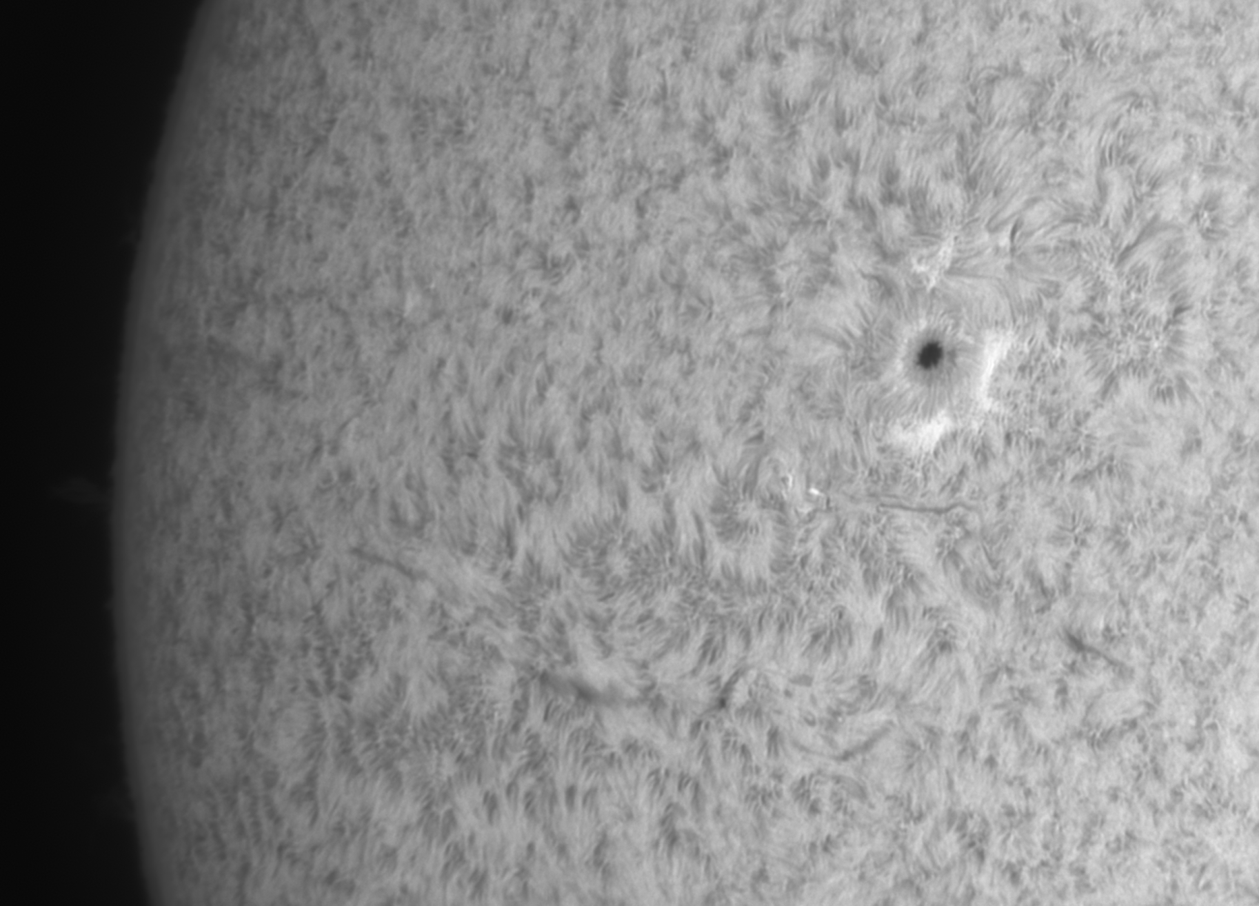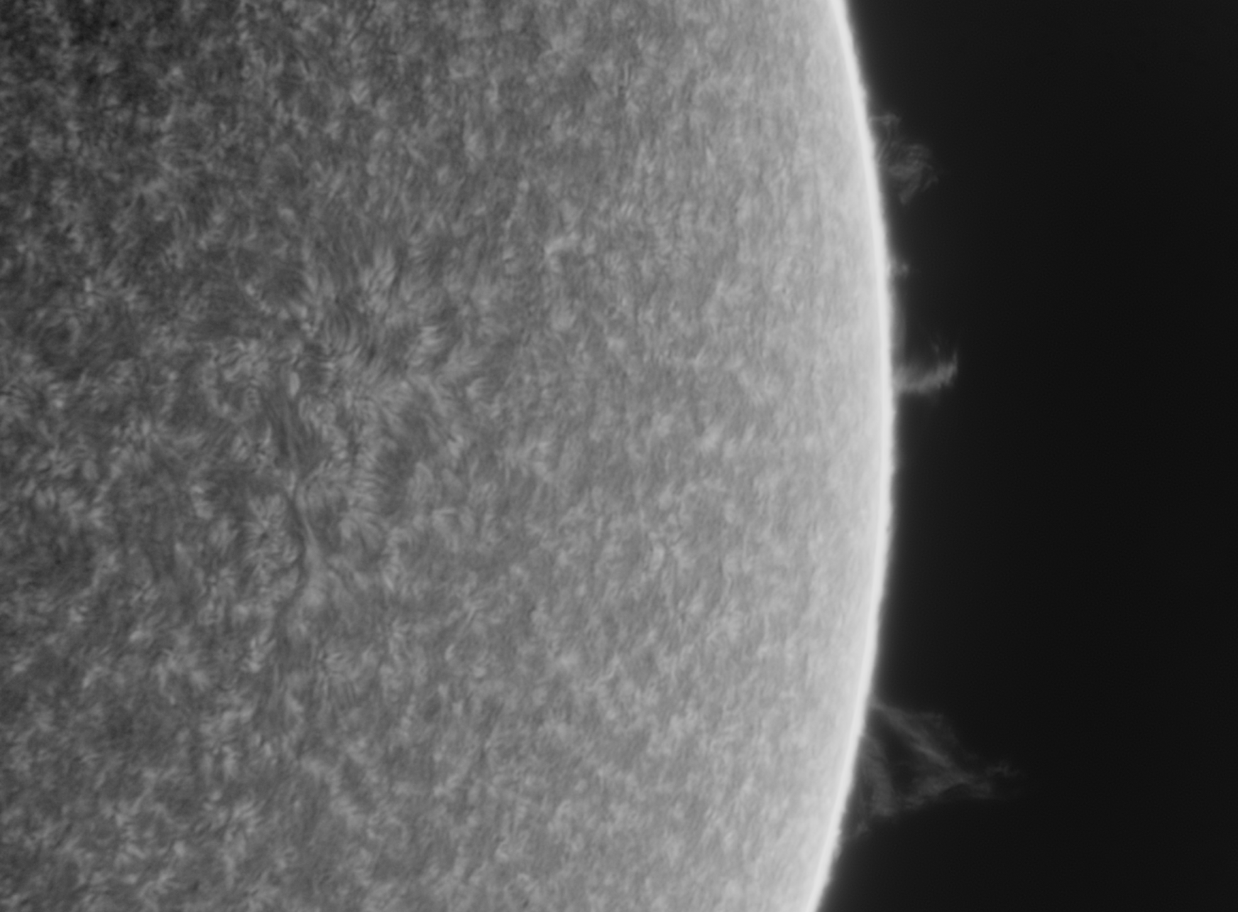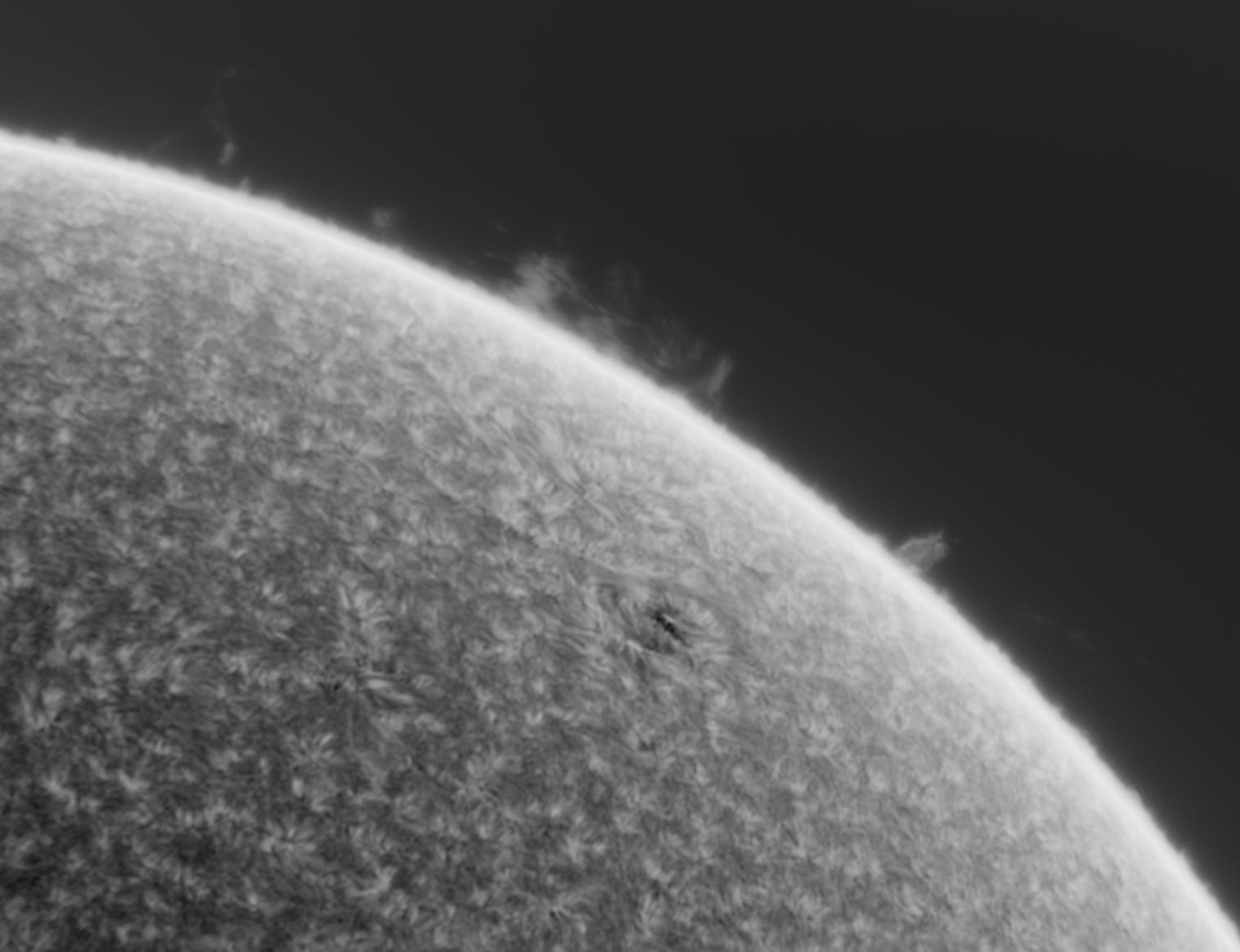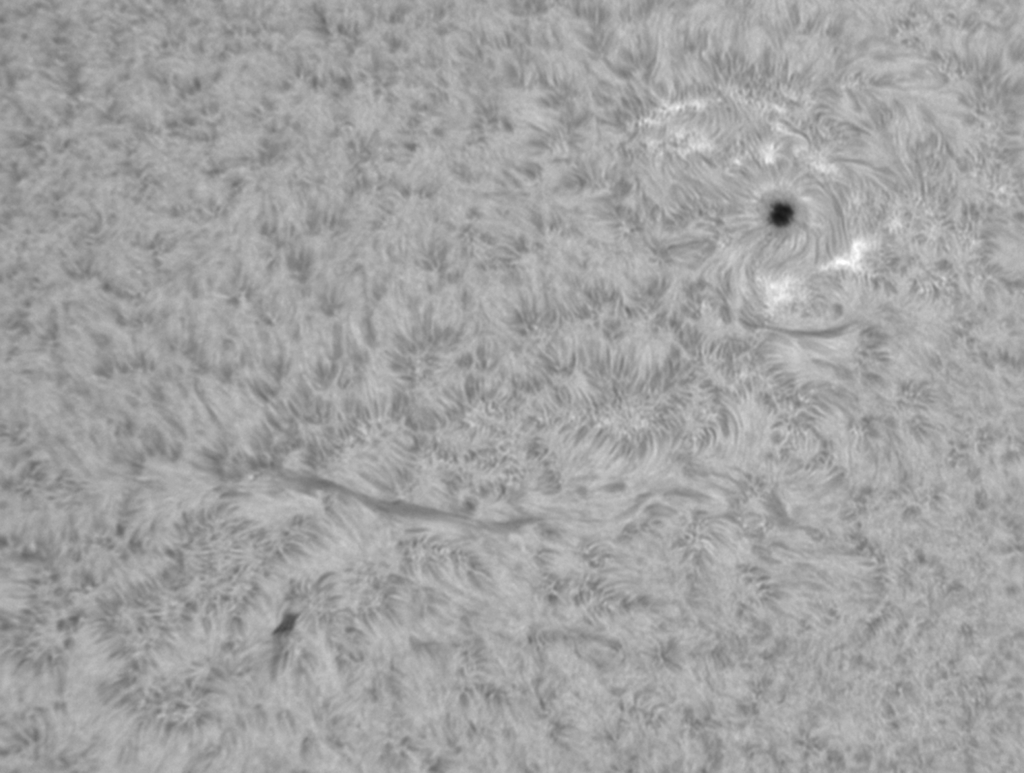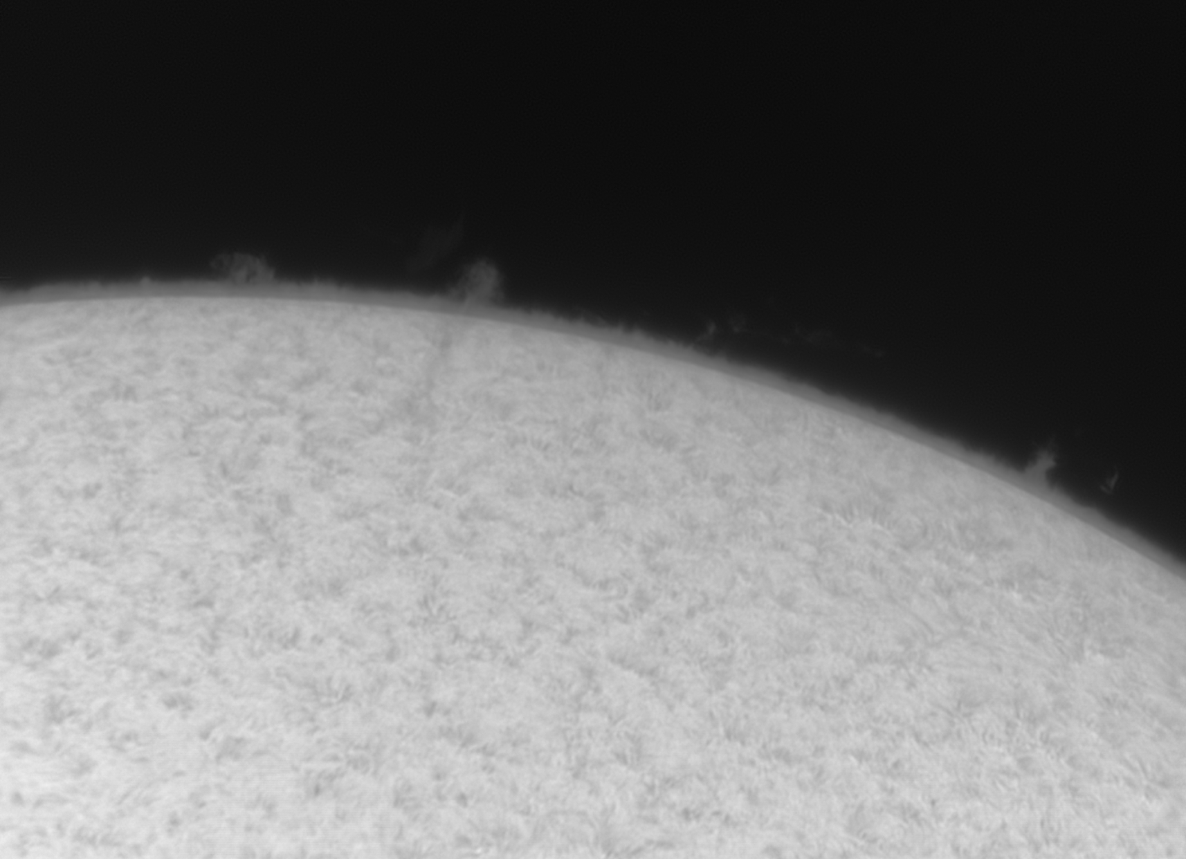 Pár hodín pred letným slnovratom zdobí slnečnú fotosféru jediná aktívna oblasť s jednou veľkou škvrnou, okolo ktorej sú ďalšie dve-tri maličké škvrnky. Zato v chromosfére obklopuje túto škvrnu v regióne AR2833 výrazné flokulové pole. Naľavo od oblasti sa tiahne nádherný dlhý filament s krásnou štruktúrou v okolí. Zopár ďalších nevýrazných filamentov vidno v severnej aj južnej časti disku. Na okrajoch potom znovu krásne protuberancie, predovšetkým dole vľavo. V priloženej animácii (snáď bude fungovať) vidno zmenu týchto výrazných protuberancií v priebehu 40 minút. Pri niektorých ide o značnú zmenu, pri predstave, že každá z nich je niekoľkonásobné väčšia ako naša planéta.