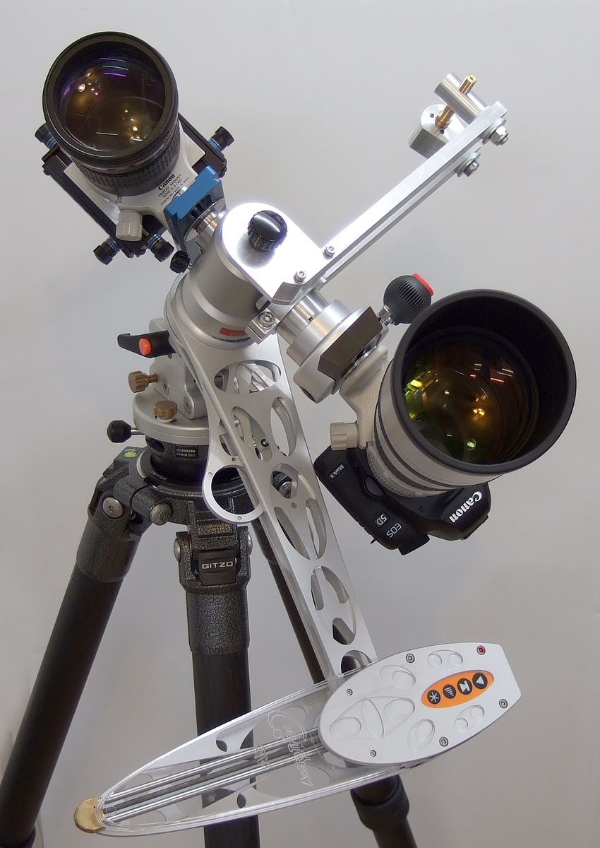 Na co je si treba dat pozor je stativ a pripadna "paralakticka kolebka" pro nastaveni na pol. Bohuzel standardne pouzivana geared fotograficka hlava Manfrotto 410 a klasicky fotostativ podobny typu Manfrotto 055 jsou pro delsi expozice teleobjektivy nedostatecne stabilni.