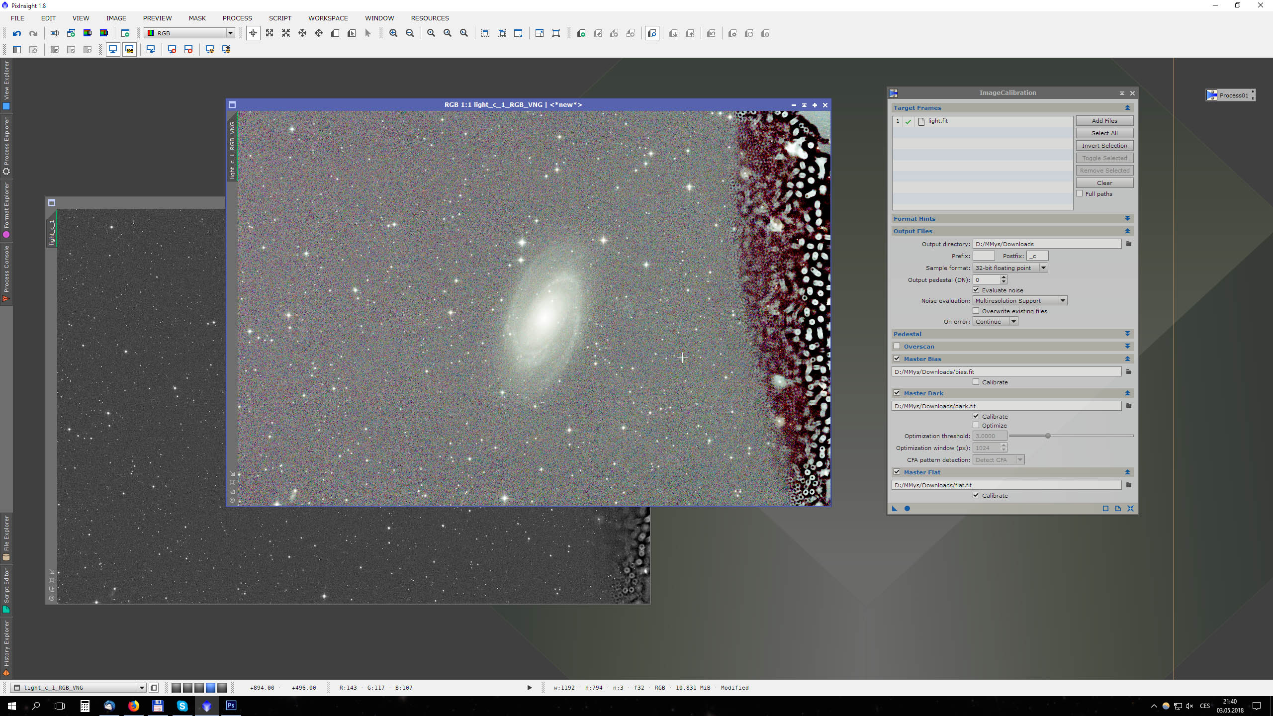 Zkusil jsem to nyní i pomocí calibration procesu, předtím jsem to dělal pomocí PixelMath. Ale i pomocí toho procesu je to bez prouh. Použil jsem jenom ty single snímky, co jsi dal ke satžení (dark, flat, bias, light). Viz níže na klik. Šmouhy tam nejsou ani po debayeringu při extrémním stretchnutí. Ale zbyly tam hotpixely, ten DF nesedí. Ale to vyeliminuje dithering při focení a lepší DF.